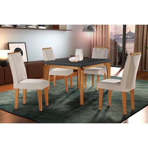 Conjunto: Mesa de Cozinha Londrina c/ Tampo Madeirado c/ Vidro Canto Reto 120x80cm e 4 cadeiras Amsterdã Imbuia/Grafite - Suede Creme - Rufato - Blush