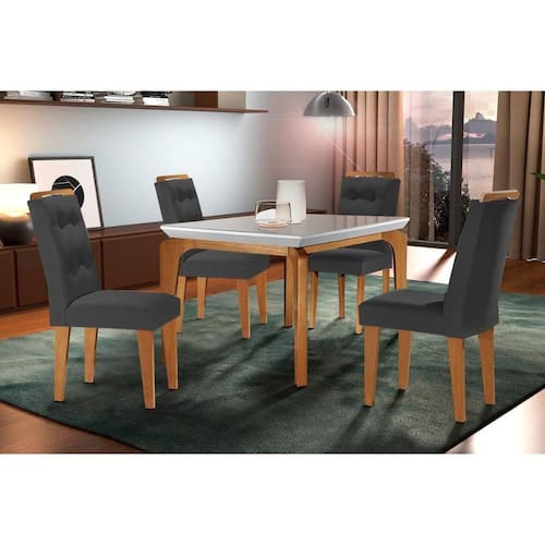 Abaixo segue os produtos do KIT: Sala de Jantar Completa Londrina c/ Tampo Madeirado c/ Vidro Canto Reto 120x80cm e 4 cadeiras Imperatriz Imbuia/Off White - Suede Grafite - Rufato