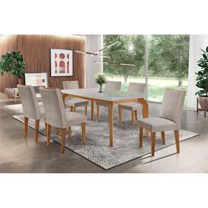 Sala de Jantar Completa Londrina Tampo Madeirado c/ Vidro 180x90cm e 6 Cadeiras Jade Capuccino/Suede Creme - Rufato
