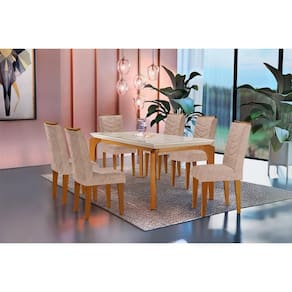 Sala de Jantar Completa Londrina Tampo Madeirado c/ Vidro 180x90cm e 6 Cadeiras Londrina Capuccino/Suede Creme - Rufato
