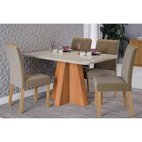 Sala de Jantar Completa Maitê Tampo Madeirado c/ Vidro 130x80cm e 4 Cadeiras Fernanda Cinamomo/Off White - Carvalho/Suede Joli Capuccino - Cimol