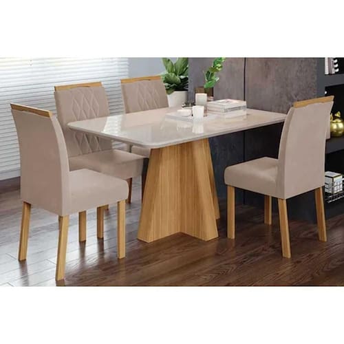 Abaixo segue os produtos do KIT: Sala de Jantar Completa Maitê Tampo Madeirado c/ Vidro 130x80cm e 4 Cadeiras Juliana Nature/Off White - Carvalho/Linho Bege - Cimol