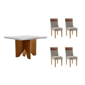 Conjunto: Mesa de Cozinha Nevada c/ Tampo Madeirado c/ Vidro Canto Curvo 90x90cm e 4 Cadeiras Jaspe Naturale/Off White - Suede Capuccino - Rufato - Conjunto de Mesa de Cozinha Rufato com 4 Cadeiras