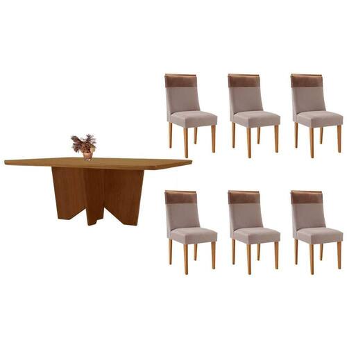 Conjunto: Mesa de Cozinha Nevada c/ Tampo Madeirado Canto Curvo 180x90cm e 6 Cadeiras Jaspe Naturale - Linho Capuccino - Rufato - Conjunto de Mesa de Cozinha com 6 Cadeiras