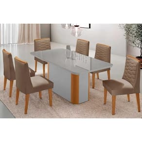 Abaixo segue os produtos do KIT: Sala de Jantar Completa Pietá c/ Tampo Madeirado c/ Vidro Canto Curvo 180x90cm e 6 Cadeiras Maldivas Naturale/Off White - Suede Capuccino - Rufato