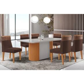 Conjunto: Mesa de Cozinha Pilar c/ Tampo Madeirado c/ Vidro Canto Curvo 180x90cm e 6 Cadeiras Jaspe Naturale/Off White - Suede Marrom - Rufato - Conjunto de Mesa de Cozinha Rufato com 6 Cadeiras