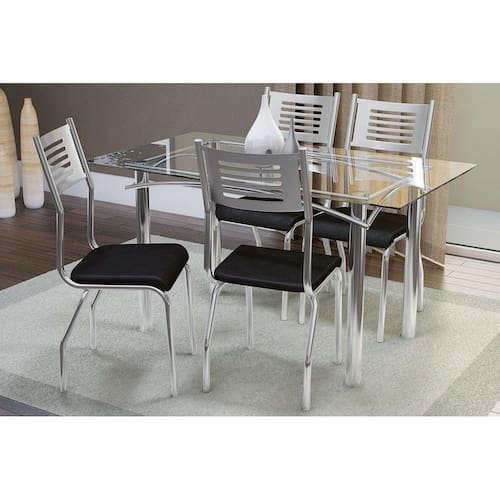 Sala de Jantar Completa Reno c/ Tampo de Vidro 150x80cm e 4 Cadeiras Nápoles 150 Cromada/Preto 110 - Kappesberg Abaixo segue os produtos do KIT: Sala de Jantar Completa Reno c/ Tampo de Vidro 150x80cm e 4 Cadeiras Nápoles 150 Cromada/Preto 110 - Kappesberg