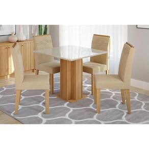 Sala de Jantar Completa Sophia c/ Tampo Madeirado c/ Vidro 95x95cm e 4 Cadeiras Taís Nature/Off White-Suede Nude Bege - Cimol
