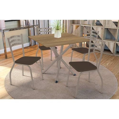 Conjunto: Mesa De Cozinha Volga C/ Tampo De Madeira 90cm E 4 Cadeiras Portugal Niquel/nogueira - Marrom - Kappesberg