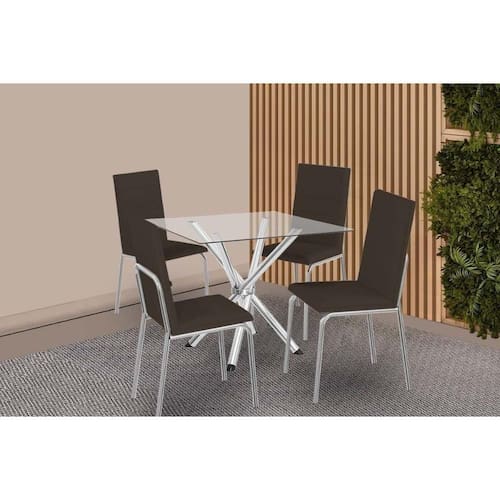 Conjunto: Mesa De Cozinha Volga C/ Tampo De Vidro 90cm E 4 Cadeiras Amsterdã Cromada - Courano Marrom - Kappesberg