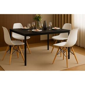 A mesa conta com tampo preto elegante e pés metálicos reforçados, garantindo resistência, durabilidade e um visual contemporâneo. As cadeiras trazem o design consagrado Eames, com assento anatômico em polipropileno e pés em madeira com estrutura metálica, proporcionando conforto e estilo em qualquer ocasião.