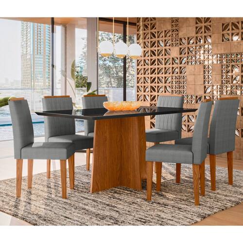 Conjunto Mesa de Jantar 1,60m Anitta -Tampo em Mdf com Vidro e 6 cadeiras Ana Ypê/Preto/Ln02 - New Ceval
