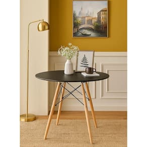 Mesa redonda com tampo em MDF na cor preta: resistente, fácil de limpar e com acabamento sofisticado.
