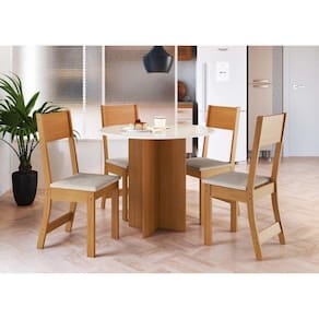 O Conjunto Mesa de Jantar e 4 Cadeiras Alice Indekes é ideal para quem deseja transformar o seu ambiente e ainda otimizar o seu espaço, tudo isso porque ele conta com uma mesa redonda que permite acrescentar mais lugares a mesa. A mesa é fabricada em MDP e pode ser usada tanto na cozinha quanto sala de jantar, já as cadeiras contam com estrutura em 100% MDF e acabamento em pintura PU esmalte, acabamento que faz toda a diferença, elas também são estofadas em espuma com densidade D-12 resultando mais conforto e qualidade! Cor: Bege