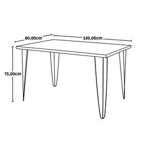 Mesa de Jantar Hairpin Legs 130x80 Branca com 6 Cadeiras Eiffel Slim A Mesa Hairpin com as Cadeiras Eiffel Slim é a escolha perfeita para você que busca renovar sua sala de jantar com um produto moderno e cheio de charme! A Mesa Hairpin é perfeita para completar a sua cozinha, sala de jantar e até áreas de festas, e o melhor: com muito mais praticidade. Em conjunto com a Cadeira Slim, é a combinação perfeita para você que deseja dar um up na decoração do seu ambiente. Sua versatilidade é seu diferencial, podendo ser incorporada à todos os momentos do seu dia a dia! Com 130cm de largura, consegue comportar facilmente até 6 pessoas e ainda sobra espaço! Com seu design industrial, consegue deixar um ambiente mais leve por conta da estrutura no estilo Hairpin Legs, uma estrutura atual conhecida pela sua praticidade e elegância. Acompanhada com da Cadeira Slim, seu revestimento conta com traços modernos e únicos, o que deixam a cadeira ainda mais bela e cheia de charme! Seu design inovador deixa todos os espaços com muito mais estilo e elegância! A Mesa Hairpin possui seu tampo fabricado em MDF BP e sua estrutura de ferro no estilo Hairpin, materiais que garantem qualidade e durabilidade ao produto. As Cadeiras que acompanham o kit possuem seu assento estofado e revestido em material ecológico, material que garante uma limpeza rápida e fácil. Sua base é produzida em madeira europeia e ferragens em metal, materiais que garante maior segurança e durabilidade. Características Técnicas Cadeira: Altura da Cadeira(cm): 76,50 Largura da Cadeira(cm): 47,00 Profundidade da Cadeira (cm): 37,00 Altura do Assento da Cadeira (cm): 48,00 Material da Estrutura da Cadeira: Madeira e Metal Material do Assento da Cadeira: Madeira, Estofada em Material Ecológico Características Técnicas Mesa: Altura da Mesa (cm): 75,00 Largura da Mesa (cm): 130,00 Profundidade da Mesa (cm): 80,00 Material da Estrutura da Mesa: Ferro Material do Tampo da Mesa: MDF Recomendações de Limpeza: Limpeza com pano úmido ou álcool, não deixar o MDF encharcado, não limpar com materiais abrasivos.