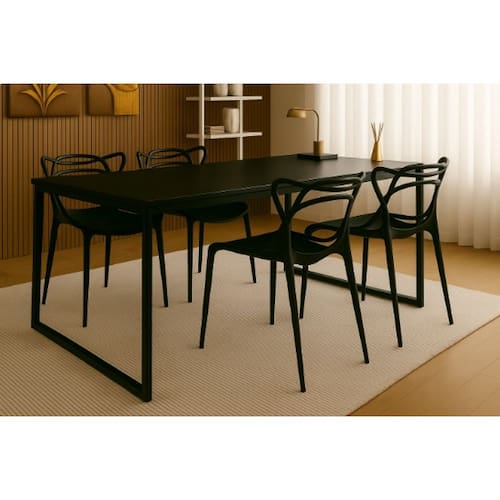 Diferenciais Design industrial moderno e versátil Mesa com tampo em MDF preto e estrutura metálica reforçada Cadeiras Allegra pretas com design ergonômico e encosto vazado Ideal para salas de jantar, cozinhas, varandas gourmet ou escritórios Fácil de montar e limpar Capacidade para até 4 pessoas Informações adicionais Produto: Conjunto mesa de jantar + 4 cadeiras Allegra Cor da mesa: Preto fosco Cor das cadeiras: Pretas foscas Material da mesa: MDF e metal Material das cadeiras: Polipropileno injetado Montagem: Simples