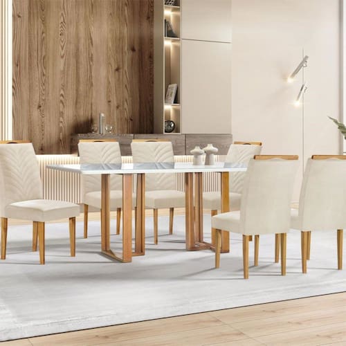 Apresentamos o Conjunto Mesa de Jantar Pequim com tampo Smart 170x90 e 6 Cadeiras da Cel Moveis. Esta mesa retangular combina modernidade e elegância, com um design minimalista que destaca sua base em madeira, criando uma estrutura sofisticada e funcional. O tampo liso e resistente é perfeito para refeições diárias e ocasiões especiais. As cadeiras oferecem conforto e estilo, com um estofado de toque suave e detalhes sutis em madeira, harmonizando com o conjunto. Ideal para ambientes contemporâneos, o conjunto Pequim proporciona sofisticação e conforto para a sua sala de jantar.
