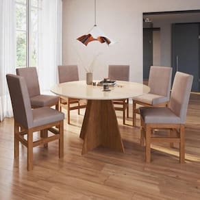 A mesa possui estrutura em MDF e MDP, com 6 lugares para cadeiras, e cor em canela; as 06 cadeiras são produzidas em madeira maciça e mista para entregar durabilidade e resistência.