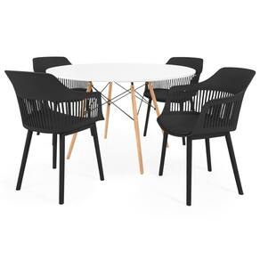 Cor: Preto | Fabricante: Magazine Decor | Quantidade de Lugares: 4 | Peso do Produto: 50 | Largura: 100 | Produto: Mesa e Cadeiras | Altura: 75 | Tonalidade: Preto | Tipo de Conjunto: Mesa e Cadeiras | Áreas Indicadas: Cozinha | Coleção Jardim: Não | Uso Indicado do Móvel: Mesa de Jantar | do modelo: 1 | Exige montagem: Sim | Baterias são necessárias?: Não | Certificação de teste externa: Não | Is Fragile: Não | de caixas: 2 | da peça: 1 | Peso do item: 50 | Principais Características do Produto (bullet_point#0): O Conjunto de Mesa de Jantar Redonda Eiffel com as Cadeiras Marcela, é uma escolha excepcional para quem busca unir estilo, praticidade e conforto em sua sala de jantar. | Principais Características do Produto (bullet_point#1): A Mesa de Jantar Eiffel, com dimensões de 120cm, é construída em MDF Laqueado de alta qualidade, garantindo durabilidade e facilidade de limpeza. | Principais Características do Produto (bullet_point#2): O visual moderno e minimalista da Cadeira Marcela adiciona um toque de elegância ao seu espaço. | Componentes incluídos: 1 Mesa + 4 Cadeiras | Quantidade de itens: 5 | Dimensões do item P x L x A: 75x100x100