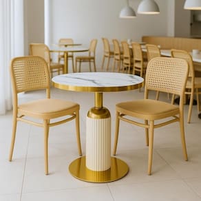 A mesa Imperial destaca-se pelo seu formato redondo de 70cm, que favorece a convivência e otimiza o espaço. Seu tampo de mármore sintético é fácil de limpar e altamente resistente ao uso diário. A base em metal garante firmeza e durabilidade, enquanto o acabamento em courino ecológico PU adiciona um toque de sofisticação, complementando o design com elegância.