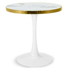 A mesa apresenta um tampo em mármore sintético, que garante um visual sofisticado e resistente, sendo fácil de limpar e ideal para o uso diário. Sua base e bordas são confeccionadas em metal, oferecendo firmeza, estabilidade e um acabamento moderno que valoriza o conjunto.