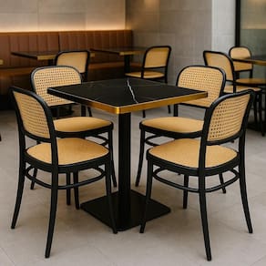 Quanto aos materiais, a mesa reúne a sofisticação do Mármore Sintético e a robustez do Metal em sua base e bordas, formando uma peça durável e elegante. Já as cadeiras são fabricadas em 100% Polipropileno, um material leve, resistente, de fácil manutenção e com excelente durabilidade, ideal para o uso cotidiano.