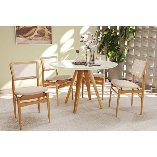 Sala Jantar Mesa Duna Premium Madeira Maciça c/ Tampo Madeirado c/ Vidro 120x120cm e 4 Cadeiras Stela Carvalho/Off White - Linho Bege Argila - Kappesberg