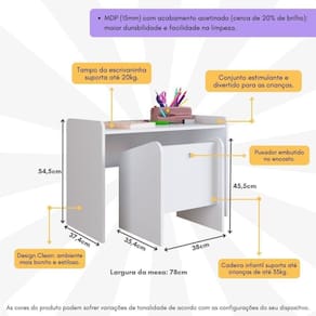 Produto Composto por: 1 mesa infantil, 1 cadeira infantil, manual de montagem e kit de ferragem.