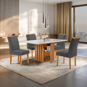 O Conjunto Mesa Elis 120cm x 90cm com 4 Cadeiras Luisa combina design sofisticado e praticidade para transformar sua sala de jantar. O tampo Slim Plus com vidro Off White adiciona um toque moderno e facilita a limpeza, tornando o dia a dia mais prático. As Cadeiras Luisa, com design elegante e ergonomia aprimorada, garantem máximo conforto para refeições prolongadas. Compacto e versátil, esse conjunto se adapta bem a diferentes estilos de decoração.