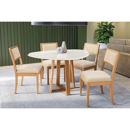 Sala Jantar Mesa Elma Premium Madeira Maciça c/ Tampo Madeirado c/ Vidro 135x105cm e 4 Cadeiras Alice Carvalho/Off White - Linho Bege Argila - Kappesberg