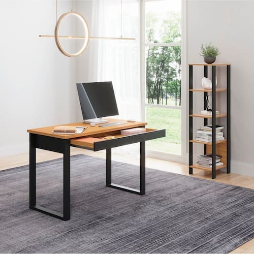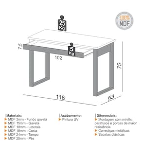 Transforme seu espaço de trabalho com o elegante Kit de Escritório. Produzido em MDF de alta qualidade e com acabamento em Pintura UV, este kit oferece não apenas uma estética sofisticada, mas também uma durabilidade superior contra riscos e desgaste. O conjunto inclui uma estante com cinco prateleiras, ideal para organizar livros, documentos e itens pessoais, mantendo seu ambiente de trabalho sempre ordenado e acessível. A mesa para escritório vem equipada com uma gaveta prática, que desliza suavemente graças às corrediças metálicas. O tampo da mesa é feito em tamburato, proporcionando uma superfície resistente e elegante. Com o Kit de Escritório, você combina funcionalidade e estilo, criando um ambiente de trabalho que inspira produtividade e organização. CARACTERÍSTICAS TÉCNICAS: - Produzida em MDF; - Acabamento em Pintura UV; - Estante com 5 Prateleiras; - Mesa para Escritóro com 1 Gaveta; - Gaveta com Corrediças Metálicas; - Tampo da Mesa em Tamburato. ITENS INCLUSOS NO KIT: F28JPF: Estante - Larg. 33cm Alt. 135cm Prof. 44cm P. 11,5kg F24JPF: Mesa para Escritório - Larg. 118cm Alt. 75cm Prof. 53cm P. 18kg INFORMAÇÕES TÉCNICAS: Altura Total: 135 cm Largura Total: 118 cm Profundidade Total: 53 cm Peso Total: 29,5 kg INFORMAÇÕES ADICIONAIS: - ATENÇÃO: Não trabalhamos e não nos responsabilizamos pela montagem do móvel. Antes da montagem conferir se o produto está de acordo com o que comprou, produto montado e danificado pela montagem não será aceito troca. Montagem e instalação por conta do comprador. - As imagens ambientadas são meramente ilustrativas e podem apresentar itens que não compõe o produto. As cores do produto podem variar de acordo com o monitor, a iluminação do ambiente ou sua percepção visual. - Limpeza: Deve ser feita com pano macio e seco ou levemente umedecido com água e sabão neutro. Não devem ser utilizados abrasivos como palha de aço e objetos cortantes. Garantia para defeitos de fabricação conforme Código de Defesa do Consumidor.