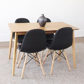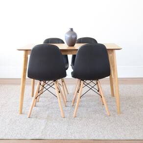 A Mesa Finlândia em madeira é ideal para quem busca elegância e praticidade, seu design rústico garante o detalhe que falta na decoração da sua casa. O conjunto com 4 cadeiras Eiffel Botonê completa o kit e garante o custo benefício para transformar o estilo divertido da sua casa com muita praticidade e toques de design. Conjunto composto por: uma Mesa com tampo em MDF de 19 mm, base em madeira seringueira + 4 cadeiras com assento revestido em PU, Base em madeira faia com armação em aço pintado. Suporta Até (kg): 120 kg Possui Rodízio: Não Altura do Conjunto: 82 cm Ambiente: null Ambiente Principal: Sala de Jantar Cor: Preto/Marroml Informação Complementar: 1x Mesa de Jantar Retangular Finlândia MarromlLargura: 120 cmAltura: 75 cmPeso: 19 kgNecessita Montagem: Sim1x Conjunto 4 Cadeiras Botonê Eiffel PretoLargura: 45 cmAltura: 82 cmPeso: 4,1 kgProfundidade: 50 cmNecessita Montagem: Sim Tamanho: