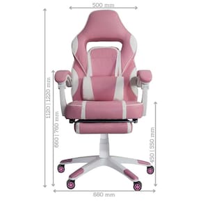 A Mesa Gamer PEL-008P Rosa tem estrutura metálica branca e tampo em MDF com revestimento rosa, que combina perfeitamente com a Cadeira Gamer PEL-3020 Rosa, que é revestida em couro PU rosa com detalhes em branco, encosto reclinável e apoio retrátil para as pernas localizado abaixo do assento que pode ser facilmente acionado; proporcionando muito mais conforto e garantindo uma ótima postura.