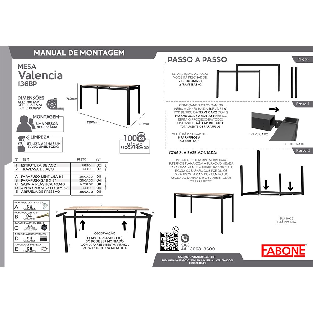 A mesa retangular de 136x80 cm possui estrutura em aço carbono com pintura eletrostática, que garante durabilidade e um acabamento impecável. Seu tampo de MDP com 30 mm de espessura oferece estabilidade e estilo, suportando até 80 kg.