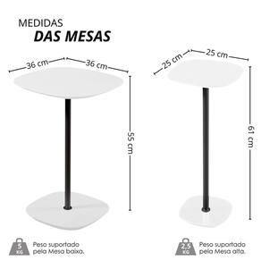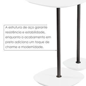 Um conjunto com duas mesas elegantes e funcionais, perfeitas para a sala de estar. Ambas possuem tampo em MDF, oferecendo resistência e um acabamento refinado, que une durabilidade e estilo. Suas bases em aço garantem estabilidade e um design contemporâneo, adicionando um toque moderno ao ambiente. Ideais para apoiar objetos decorativos ou utilitários, as mesas combinam praticidade e sofisticação de maneira harmoniosa. Ambiente Principal: Sala de Estar Complexidade da Montagem: Baixa: pode ser montado por uma pessoa sozinha Cor: Branco/Preto Cor do Produto: Branco/Preto Escala de Brilho: Fosco Itens Inclusos: 2 Mesas + Manual de Montagem + Kit ferragem. Manual de Montagem e Instalação: https://product-hub-prd.madeiramadeira.com.br/976655/documents/c83ccc61-197e-4a54-aee2-9accd063b9962666531493817387642173322.pdf Marca: Larflex Material do Tampo: MDF Material Principal: MDF Necessita Montagem: Sim Origem do Produto: Nacional Peso: 4,4 kg Possui Espelho: Não Possui Possui Gavetas: Não Possui Portas: Não Possui Prateleiras: Não Recomendações de Uso, Manutenção e Limpeza: Pano levemente umedecido e pano seco. Não utilizar produtos de limpeza Sistema de Montagem: Encaixe. Suporta Até (kg): 5 kg