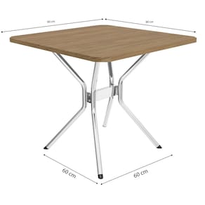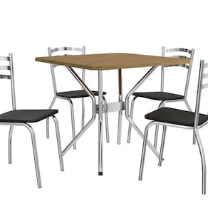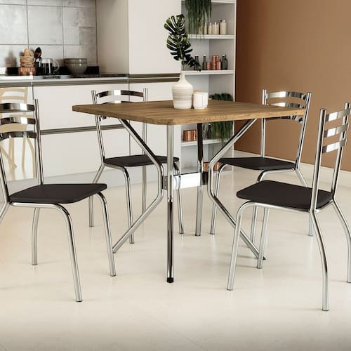 Para todos os espaços, aposte no conjunto CMC790 da Kappesberg. Em estrutura metálica cromada, a mesa conta com estrutura tubular circular, e com uma travessa central, os pés são dispostos em "K". Medindo 80,5cm de altura e 60cm de largura e profundidade, combinada com o tampo quadrado F090, em chapa MDP de 25mm e pintura touch na cor nogueira, ele possui pontas chanfradas e acomoda até quatro pessoas. Já as cadeiras, no modelo Portugal, também em estrutura metálica cromada, medindo 87,5cm de altura, sendo 46cm a altura do assento, suportam até 130kg, garantindo estabilidade e resistência. E para mais comodidade, o assento é estofado e recoberto com sintético na cor preta. Já o encosto, garante um encaixe perfeito com as costas, proporcionando conforto ao produto.