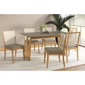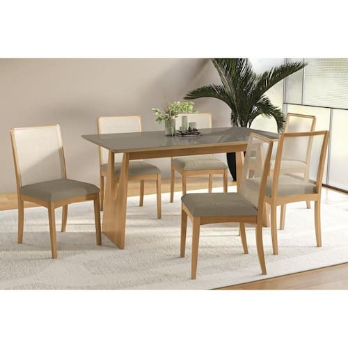 Sala Jantar Mesa Mila Premium Madeira Maciça c/ Tampo Madeirado c/ Vidro 160x90cm e 6 Cadeiras Lara Carvalho/Freijo Bronze - Boucle Bege Fendi - Kappesberg
