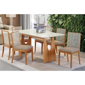 Sala Jantar Mesa Mila Premium Madeira Maciça c/ Tampo Madeirado c/ Vidro 180x90cm e 6 Cadeiras Lara Carvalho/Off White - Boucle Bege Fendi - Kappesberg