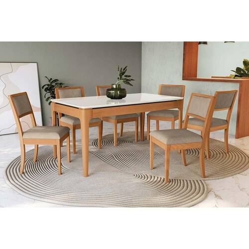 Sala Jantar Mesa Mira Premium Madeira Maciça c/ Tampo Madeirado c/ Vidro 160x90cm e 6 Cadeiras Alice Carvalho/Off White - Boucle Bege Fendi - Kappesberg