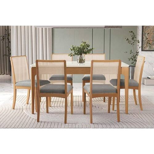 Sala Jantar Mesa Mira Premium Madeira Maciça c/ Tampo Madeirado c/ Vidro 160x90cm e 6 Cadeiras Lara Carvalho/Off White - Boucle Bege Fendi - Kappesberg