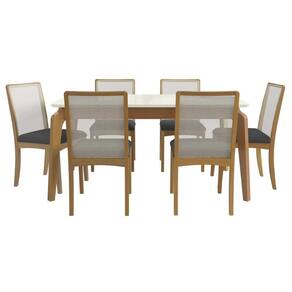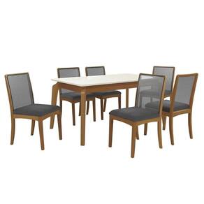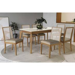 Sala Jantar Mesa Petra Premium Madeira Maciça c/ Tampo Madeirado c/ Vidro 160x90cm e 6 Cadeiras Lara Carvalho/Off White - Boucle Bege Fendi - Kappesberg