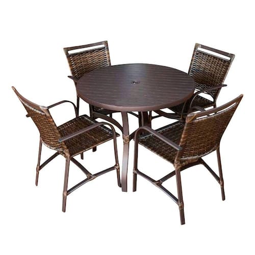 AS IMAGENS SÃO MERAMENTE ILUSTRATIVAS E PODEM SOFRER VARIAÇÕES DE COR E PEQUENOS DETALHES DE ACORDO COM O SEU MONITOR, ILUMINAÇÃO DO AMBIENTE E ATÉ MESMO A SUA PERCEPÇÃO VISUAL.Conjunto Mesa Redonda 1,00 Com 4 Cadeiras Betta Em AlumÃnio Ãrea Externa Marrom