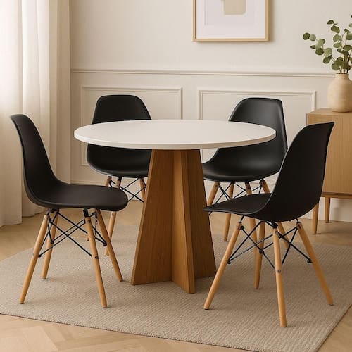 Transforme sua sala de jantar ou cozinha com este elegante conjunto de mesa redonda com 4 cadeiras, que combina design moderno, funcionalidade e conforto. Ideal para ambientes compactos ou integrados, esse conjunto é perfeito para quem busca estilo escandinavo, sofisticação e praticidade no dia a dia.