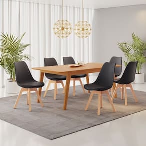 As mesas são indispensáveis para o bom funcionamento de uma casa e por isso a Mesa Elegance é ideal para cozinhas ou salas de jantar. Possui amplo espaço para que você possa dispor pratos, copos, talheres e objetos diversos. Com pés em madeira maciça o móvel é de fácil combinação sendo perfeito para a sua rotina ou reuniões de convidados.Procurando uma Cadeira que une design, elegância e conforto? Conheça nossa Cadeira Saarinen Wood com Base de Madeira Natural. Eero Saarinen foi um designer finlandês de muito sucesso na década de 50 e produziu móveis icônicos que são inspiração para o desenvolvimento de móveis até hoje. A clássica cadeira com assento estofado que leva seu nome vem agora com uma versão mais moderna. A Cadeira Saarinen Wood com Base de Madeira Natural é ideal para ambientes como; sala de jantar, sala de estar, cozinha, áreas internas, mesas de leitura e muito mais. O conjunto combina com diversos ambientes e estilos. Medida da Mesa (A x L x P): 78cm x 120cm x 80cm Peso da Mesa: 30 kg Mesa suporta até: 35.0000 Altura do Conjunto: 82 cm Ambiente: null Ambiente Principal: Sala de Jantar Apoio para Braços Estofado: Não Cadeira/Banco suporta até: 110.0000 codigo_ean: 7909903406137 Complexidade da Montagem: Baixa: pode ser montado por uma pessoa sozinha Cor: Preto/Cinamomo Cor do Produto: Preto/Cinamomo Cor do Tampo: Natural De Canto (Canto Alemão): Não Espessura do Tampo: 25 mm Formato do Tampo: Retangular Informação Complementar: 1x Cadeira para Sala de Jantar Saarinen PP Preto Largura: 49 cm Altura: 82 cm Peso: 4,6 kg Profundidade: 56 cm Necessita Montagem: Sim