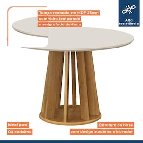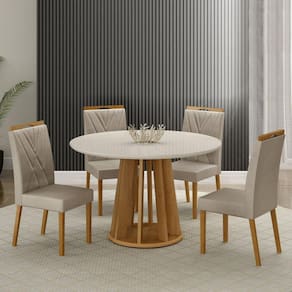 Adicione charme e funcionalidade à sua sala de jantar com o conjunto Rose, acompanhado de 4 cadeiras. A mesa redonda oferece um design versátil e elegante, ideal para otimizar espaços pequenos. Com seu tampo espaçoso, proporciona um cenário encantador para refeições em família ou encontros com amigos. As cadeiras, com seu estofamento confortável e design contemporâneo, completam o conjunto com estilo e conforto. Juntos, oferecem não apenas funcionalidade, mas também um toque de sofisticação para sua casa. Medida da Mesa (A x L x P): 78cmx120cmx120cm Peso da Mesa: 46,8 kg Mesa suporta até: 40.0000 Acabamento da Cadeira/Banco: Pintura UV Acabamento da Mesa: Pintura UV Acompanha Manual de Instalação: Sim Almofada do assento: Fixa Almofada do encosto: Fixa Ambiente Principal: Sala de Jantar Cadeira/Banco estofada: Sim Cadeira/Banco suporta até: 120.0000 codigo_ean: 7909903574003 Complexidade da Montagem: Média: pode ser montado por mais de uma pessoa e/ou necessite de maior conhecimento para montagem Cor: Cinamomo/Off White/Bege Cor do Produto: Cinamomo/Off White/Bege Enchimento do Assento: Espuma D-23 Enchimento do Encosto: Espuma D-18 Escala de Brilho: Fosco Espessura do Tampo: 4 mm Estrutura do Assento: Madeira Itens Inclusos: 1 mesa Rose com 4 cadeiras Lara, manual de montagem e kit ferragens Manual de Montagem e Instalação: https://product-hub-prd.madeiramadeira.com.br/891888/documents/57c7df2d-4592-4c43-8676-0c5a151b9fe95515mesarosecomcadeiralara.pdf Material da Base da Mesa: MDF/MDP Material da Estrutura da Cadeira: Madeira Maciça Material do Tampo: Vidro Material Principal: MDF/MDP Medida da Cadeira/Banco (A x L x P): 97cmx45cmx60cm Medida do Tampo (L x C x E): 78cmx120cmx2,5cm Mesa Dobrável: Não Mesa Extensível: Não Necessita Montagem: Sim Origem do Produto: Nacional Peso da Cadeira/Banco: 10,5 kg Possui Apoio para Braços: Não Possui Apoio Para os Pés: Não Possui Prateleiras: Não Possui Suporte Giratório: Não Possui Vidro: Sim Quantidade de Cadeiras: 4 Quantidade de Lugares: 04 Recomendações de Uso, Manutenção e Limpeza: Para limpeza utilizar apenas um pano úmido. Revestimento da Cadeira/Banco: Veludo Sistema de Montagem: Parafusos Tipo de Assento: Fixo Tipo de Encosto: Fixo Vidro Temperado: Sim