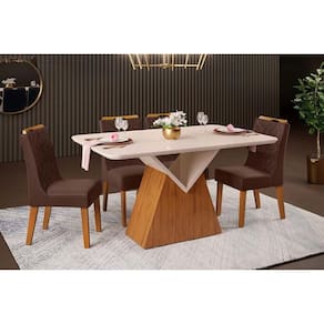 Conjunto: Mesa Sala Jantar Argo c/ Tampo Madeirado c/ Vidro Curvo 136x90cm e 4 Cadeiras Stela Freijo/Off White - Suede Moca - DJ Móveis - Blush