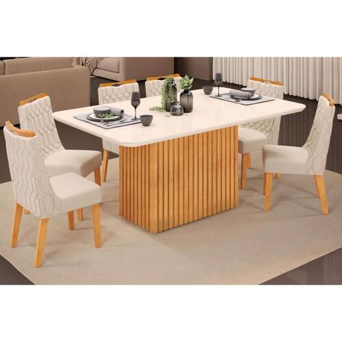 Sala de Jantar Completa Canes Tampo Madeirado c/ Vidro Curvo 170x90cm e 6 Cadeiras Bia Cedro/Off White - Linho Neve - DJ Móveis Abaixo segue os produtos do KIT: Sala de Jantar Completa Canes Tampo Madeirado c/ Vidro Curvo 170x90cm e 6 Cadeiras Bia Cedro/Off White - Linho Neve - DJ Móveis