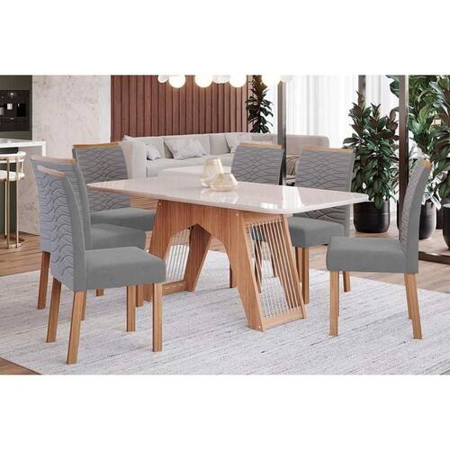Conjunto: Mesa Sala Jantar Carol Tampo Madeirado c/ Vidro 180x90cm e 6 Cadeiras Clarice Madeirado/Linho Grafite - Cimol - Cinza