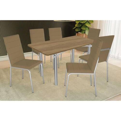 Sala de Jantar Completa Elba c/ Tampo de Madeira 160cm e 6 Cadeiras Amsterdã Cromada/Nogueira - Courano Capuccino - Kappesberg