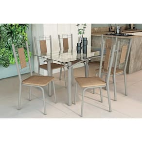 Sala de Jantar Completa Elba c/ Tampo de Vidro 150cm e 6 Cadeiras Florença Niquel - Courano Capuccino - Kappesberg